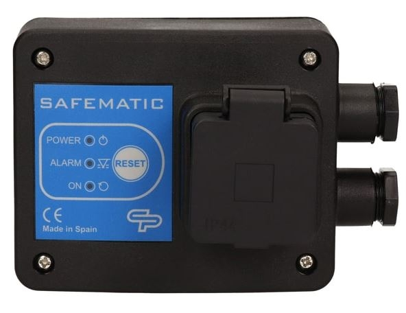 Elektroniczny system do ochrony pompy Safematic S to urządzenie które zatrzyma pompę w przypadku pracy na sucho lub w przypadku przeciążenia. Posiada zintegrowane gniazdo SCHUKO do podłączenia pompy oraz wtyczkę zasilania.